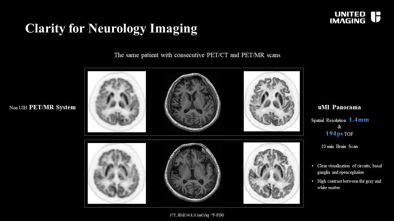 uMI Panoramaは従来のUnited Imaging 社製PET/CT装置uMI780、uMI550と同様2.76mm×2.76mmのLYSOクリスタルによる空間分解能2.9mmと高分解能を維持しつつ、TOF時間分解能を194psまで高めることにより、実効感度143cps/kBqを実現した高分解能と高感度を両立したPET/CTです。